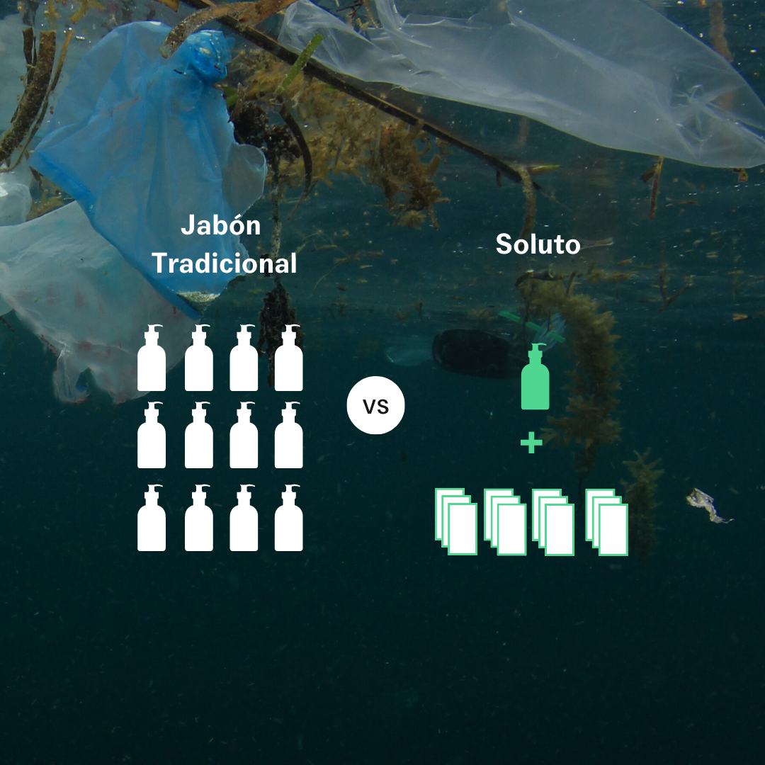 Un sobre de Soluto pesa menos de 30g mientras que una botella de gel de ducha de 400ml pesa aproximadamente 500g. Esto reduce el consumo de combustible en el transporte y las emisiones de CO2 en un 90% en comparación con los jabones líquidos.